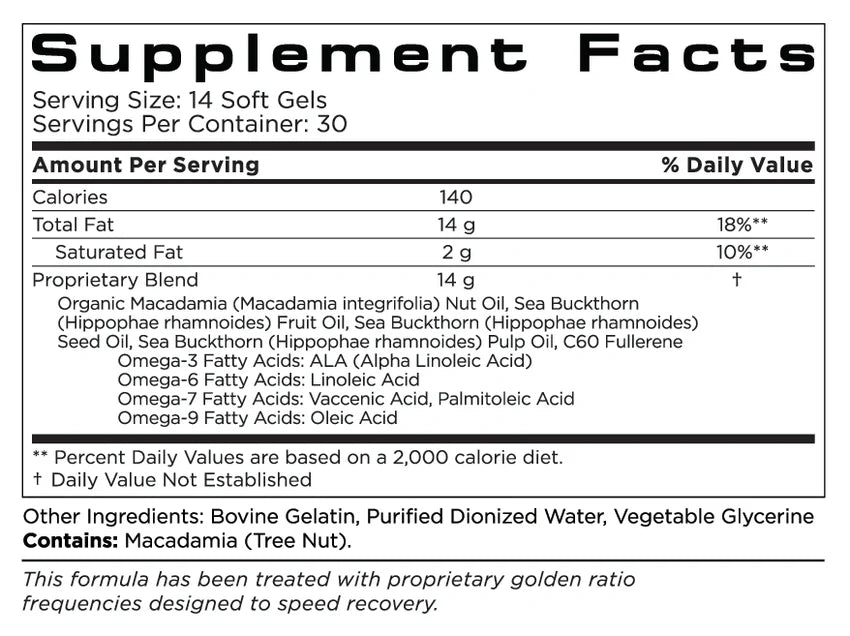 Softgel formula featuring macadamia oil, sea buckthorn oils and a spectrum of omega fatty acids; see packaging for a complete ingredient list and allergen information.